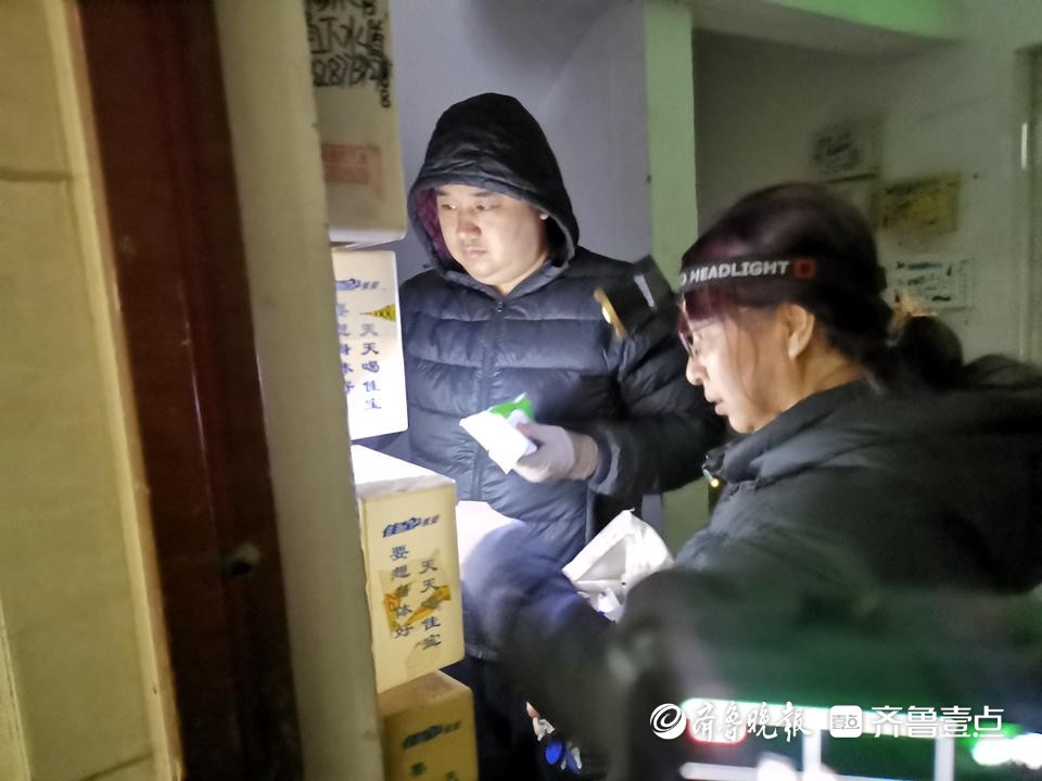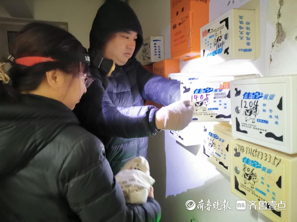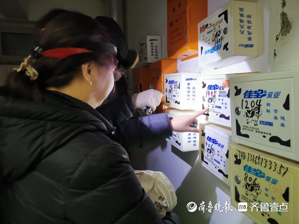 5点10分,到达送牛奶的第一个目的地——福盛小区。徐敏星用头灯照亮单元楼前的奶箱,大帅独立完成开锁、投递牛奶、归位的流程。