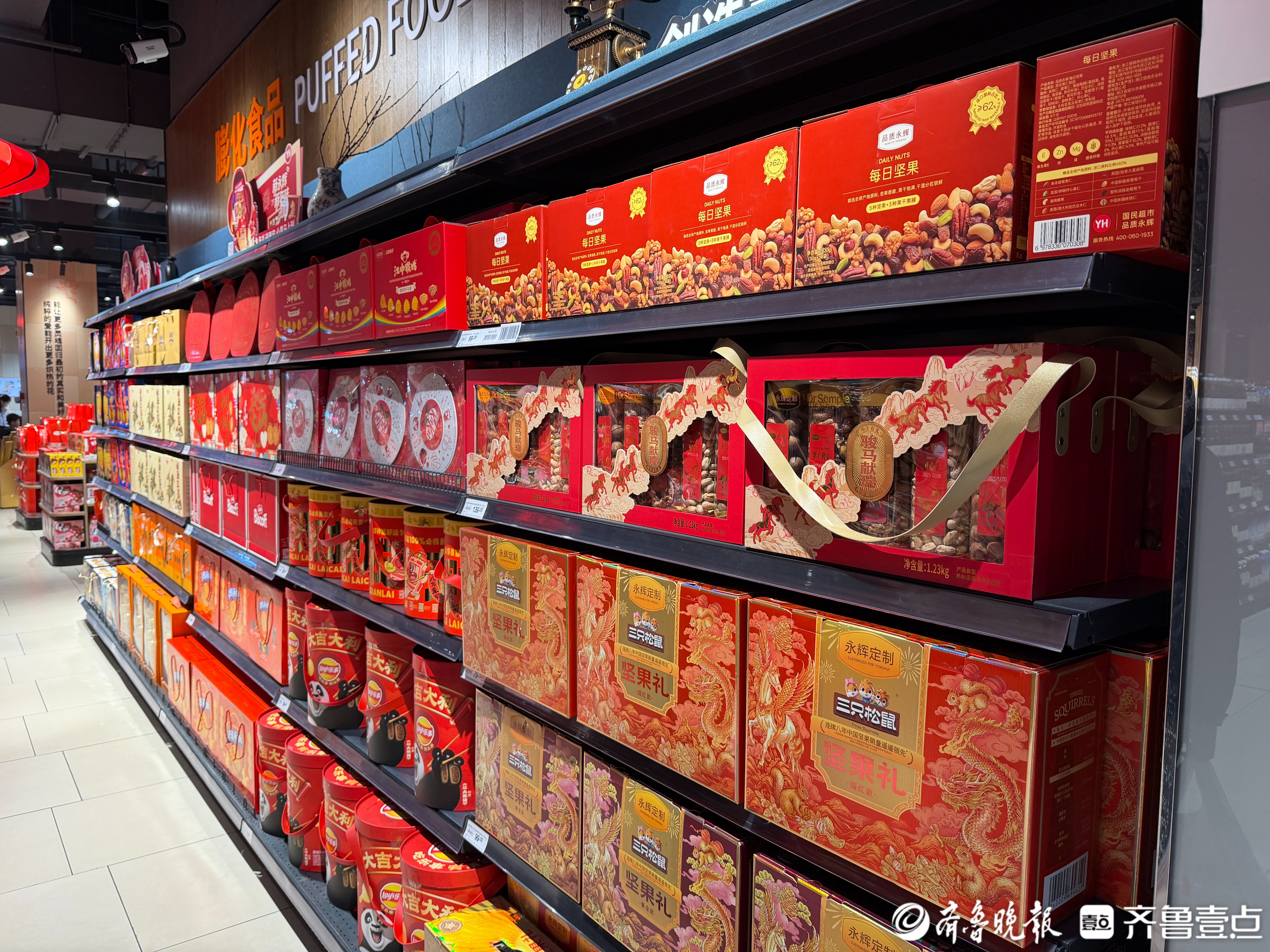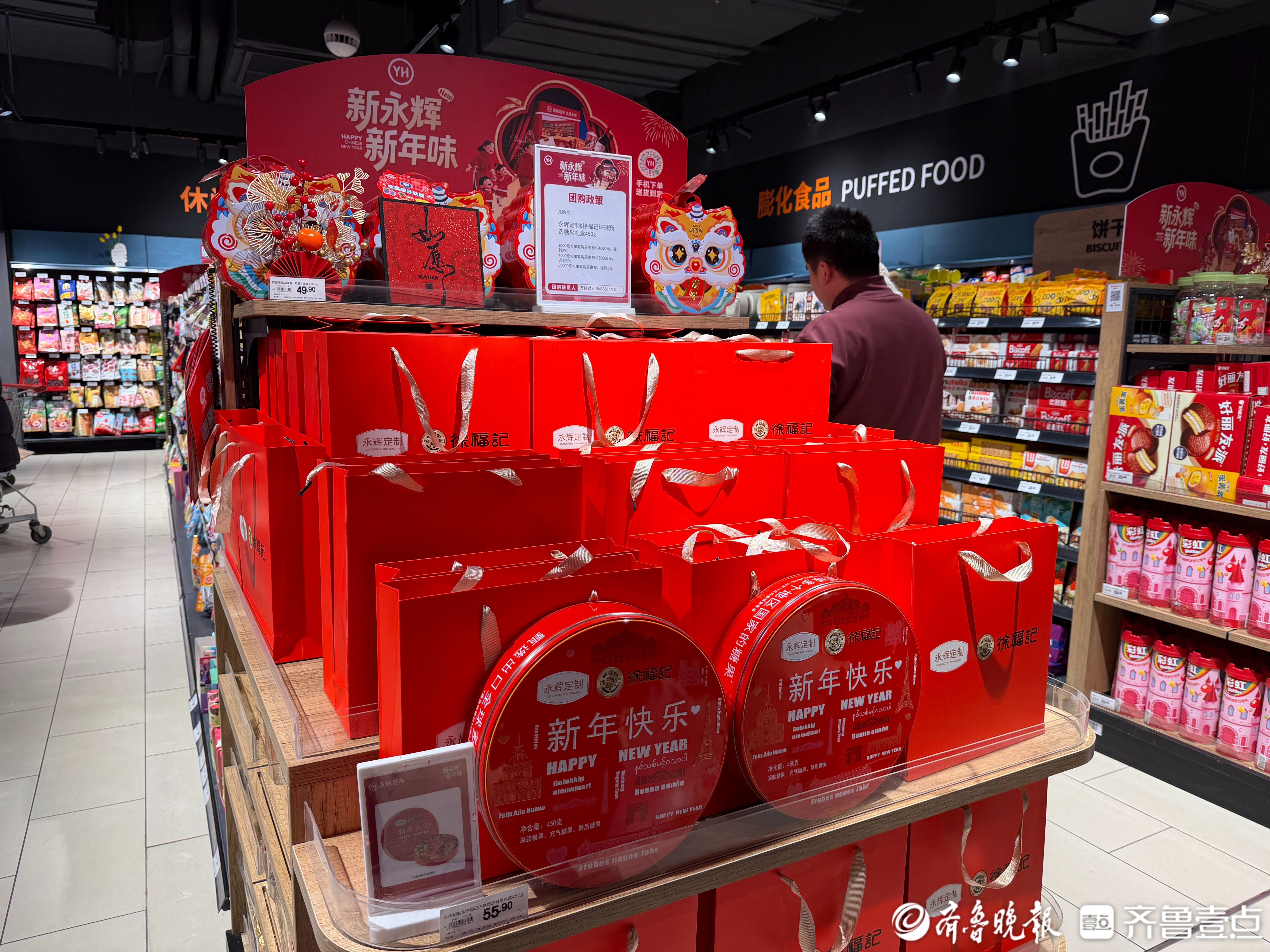在泰安爱琴海永辉超市内,记者看到消费者络绎不绝、年味氤氲。“永辉定制”专区内,永辉与徐福记、三只松鼠、旺旺等一线国民大品牌联名推出的礼盒整齐陈列,款式丰富、包装精致,一上架便成为市民选购年货的热门之选。