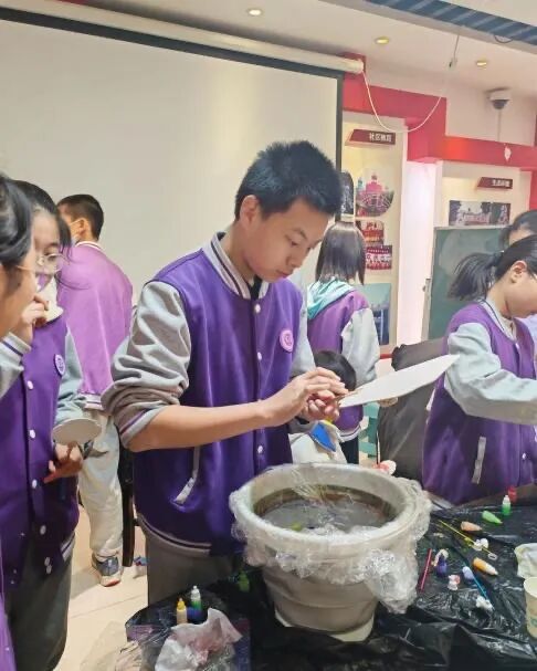 “原来漆扇要经过这么多道工序!”一位同学轻声感叹。在老师的指导下,同学们小心翼翼地将扇面浸入调制好的漆液,通过提、浸、转、流等手法,让天然漆料在扇面上自由流淌、交融。色彩的碰撞间,独一无二的纹理与图案渐渐显现,每一把扇子都因手法、角度与时间的细微差异而成为孤品。