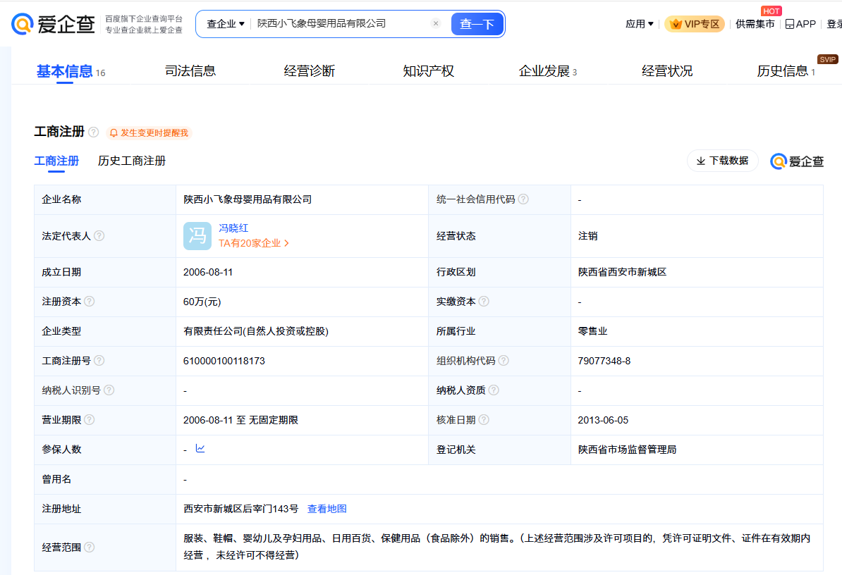 据公开资料显示,小飞象母婴用品有限公司于2006年9月份正式注册成立,目前在中西部行业内居于领先地位。拥有连锁门店1400余家,经营覆盖陕西省、河南省、山西省、青海省、内蒙古、宁夏、甘肃、新疆、山东、河北、福建、浙江、江苏13省区的多个地区,注册会员超过720万个家庭。是专注于孕妈妈、婴幼儿、3-12岁儿童服饰、喂养、洗护、出行用品、奶粉、营养品等生活所需的孕婴童商品零售商店。