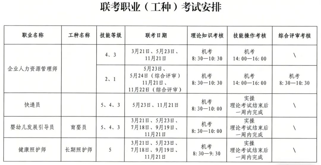 企业人力资源管理师、婴幼儿发展引导员(育婴员)、健康照护师(长期照护师)、快递员,具体职业(工种)、等级及时间安排见附件1。社评组织不得在非联考时间组织开展联考职业(工种)的技能等级认定。