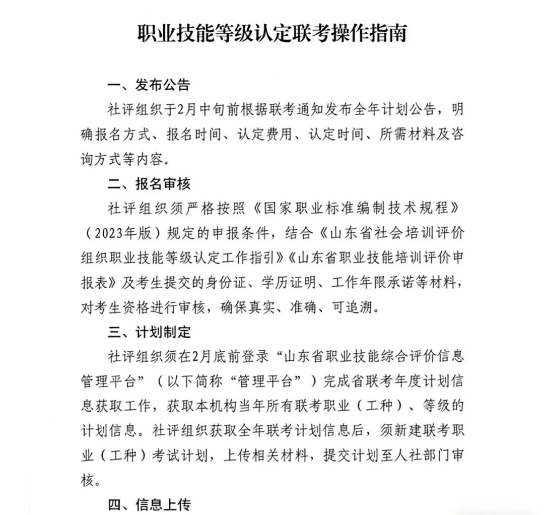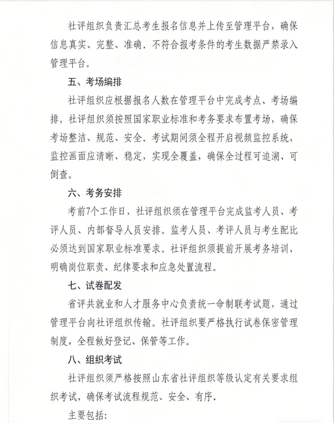 社评组织负责本机构年度计划公告发布、考试报名、资格审核、考试具体组织实施及证书发放等工作。省公共就业和人才服务中心负责试题命制、统一制定联考计划信息。社评组织 在山东省职业技能综合评价信息管理平台(以下简称“管理平台”)获取联考计划信息后实施。联考试题通过管理平台配发,2月底前,各社评组织要完成本机构使用的在线机考系统与管理平台的技术对接测试。职业技能等级认定联考操作指南见附件2。