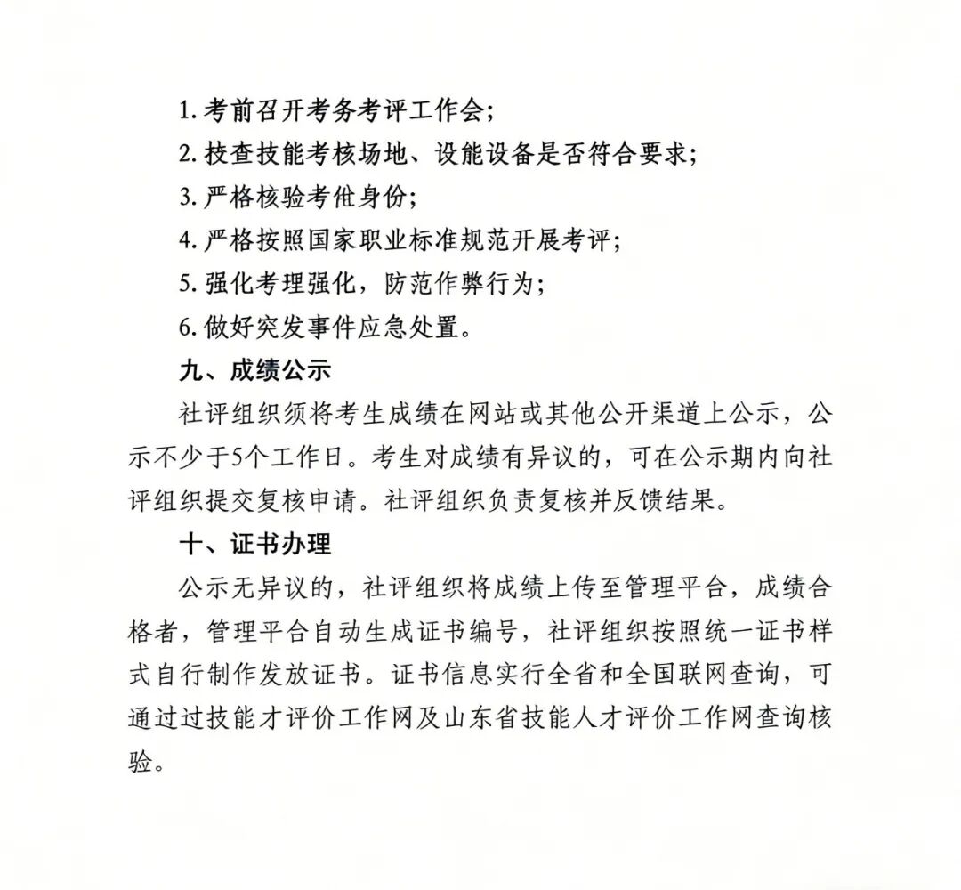 (二)严格考务管理。各社评组织按照“谁评价、谁发证、谁负责”的原则,严格执行联考要求,认真做好组织实施工作。严格执行国家职业标准、相关考务要求和保密制度,规范考试报名、资格审核、考务实施、证书发放等工作,确保认 定过程公开透明、结果真实可靠、全程可追溯。