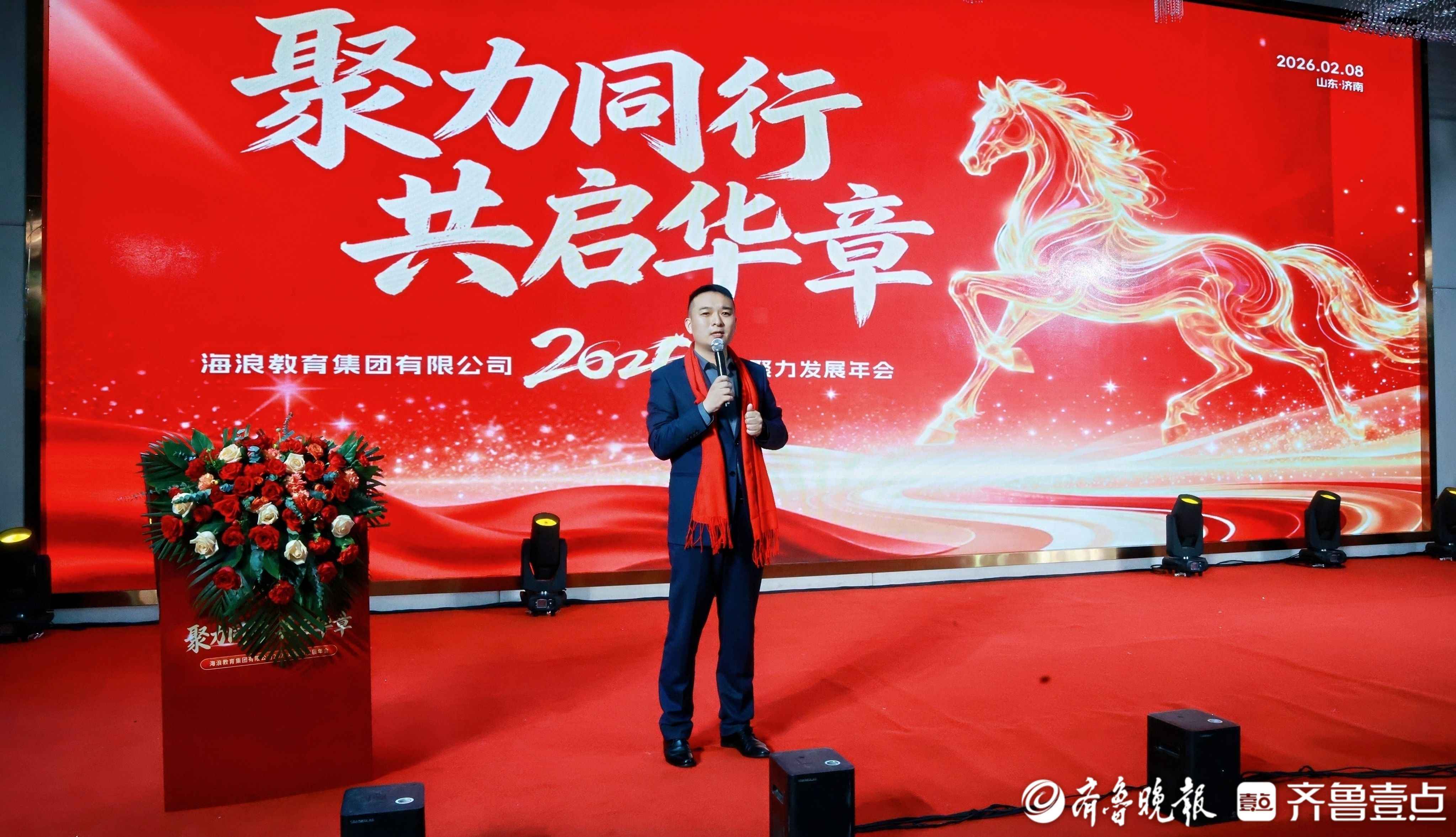 2026年2月8日,以“聚力同行,共启华章”为主题的海浪教育(集团)2025年度总结表彰大会在济南隆重举行。济南市成人教育协会会长侯桂霞,山东交通学院继续教育学院院长王德利,江苏商会党支部书记李翔,山东水发人才发展集团有限公司董事长魏国庆,企业家会客厅徐河等领导嘉宾莅临现场,与全体海浪教职工共同回顾了过往一年的奋斗历程。
