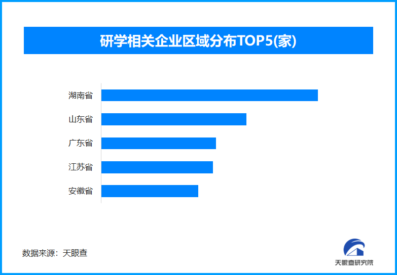 天眼查专业版数据显示,截至目前我国现存在业、存续状态的研学相关企业超2.5万家。从区域分布来看,湖南省、山东省、广东省研学相关企业数量位居前列,分别为超4000余家、2700余家和2100余家。