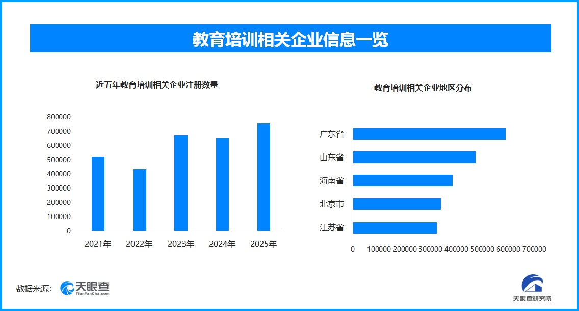 天眼查专业版数据显示,截至目前我国现存在业、存续状态的教育培训相关企业超533.7万家。其中,2025年新增注册相关企业约75.8万余家,从企业注册数量趋势来看,近五年间,教育培训相关企业的注册数量大体呈现出增长态势,并在2025年达到顶峰。