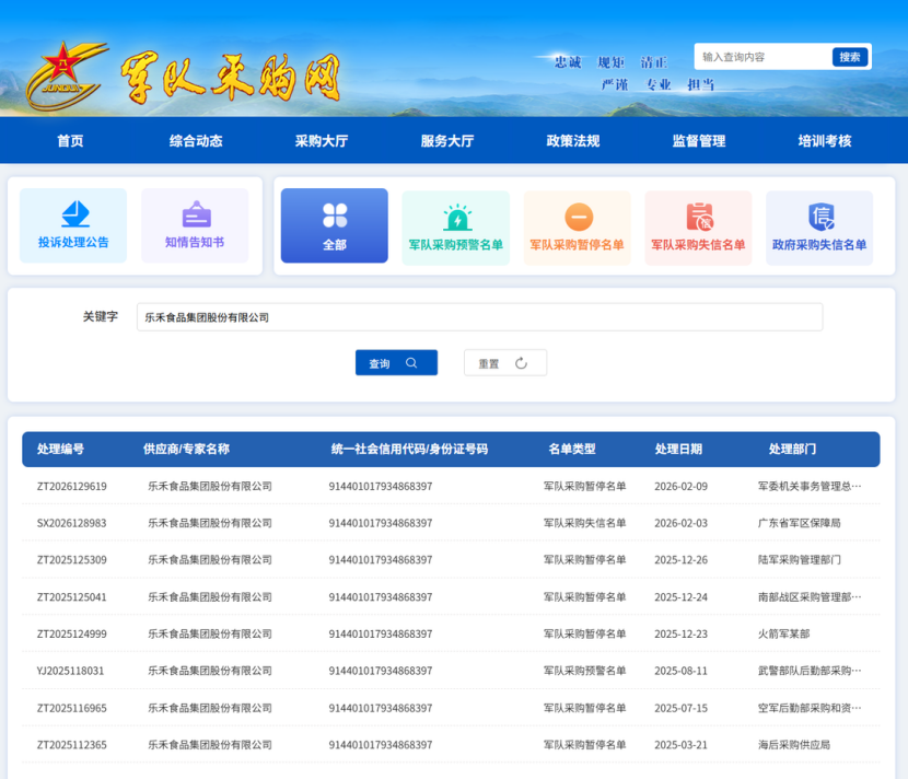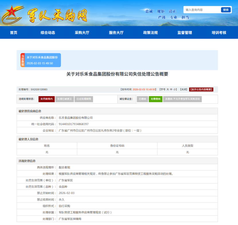 上述处罚也是本月第二次,2月3日,军队采购网发布的《关于对乐禾食品集团股份有限公司失信处理公告》(处理编号:SX2026128983)显示,经调查核实,乐禾食品集团股份有限公司在参加项目采购活动中,存在配合套现等违规行为。广东省军区保障局根据军队供应商管理相关规定,终身禁止参加广东省军区范围物资工程服务采购活动的处罚。