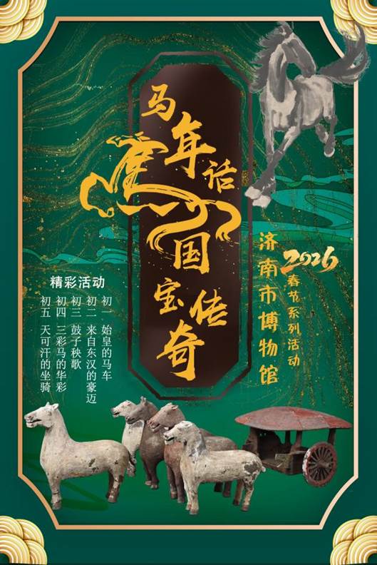 【主题及内容】生肖文化是中国传统文化的重要组成部分,马作为十二生肖中代表奋进与活力的重要属相,被赋予了极为丰富和崇高的精神内涵。恰逢2026年为农历丙午年,也是生肖马年,济南市博物馆推出“骐骥腾骧——马文化主题文物展”,以独特的视角展现马文化的多元内涵,从金戈铁马的战场英姿,到器物纹饰间的灵动形态,带领观众穿越时空,探寻马与中华文明的不解之缘,感受这一生灵在历史长河中的独特地位与永恒魅力。