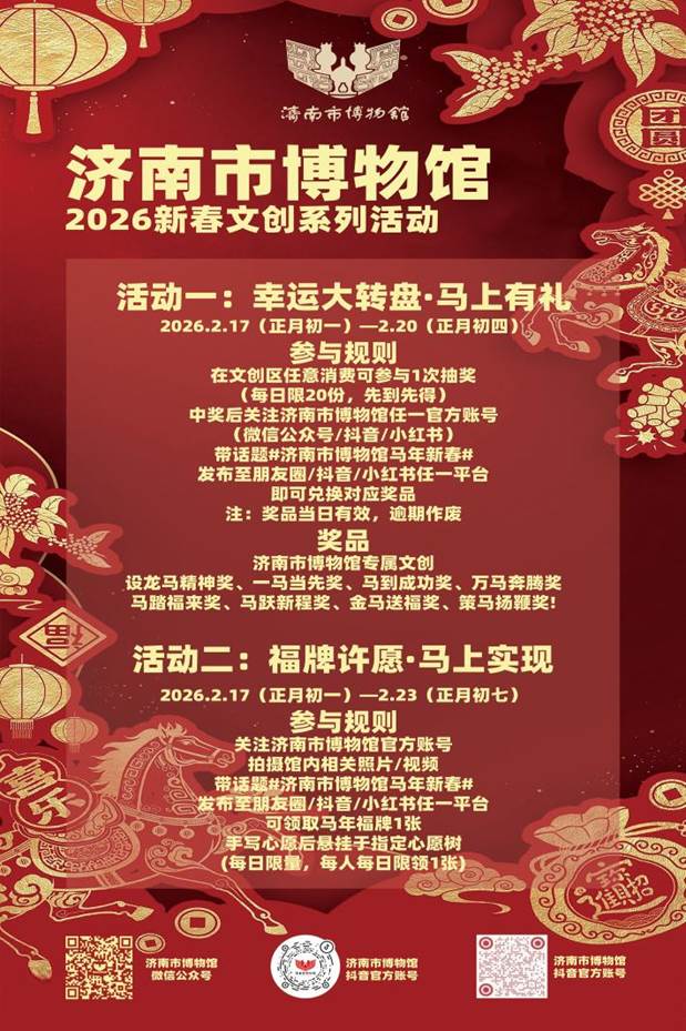 【主题及内容】活动期间,所有到馆游客关注“济南市博物馆”官方任一社交媒体账号(微信公众号/抖音/小红书),并拍摄博物馆建筑、展厅或活动相关照片/短视频,带话题#济南市博物馆马年新春#发布至微信朋友圈、抖音或小红书任一平台,即可领取马年专属福牌一张。游客可在福牌上手写新春心愿,随后悬挂于博物馆指定心愿墙,定格美好期许,共赴新春佳约。福牌每日限量发放,领完即止,每人每日限领一张。