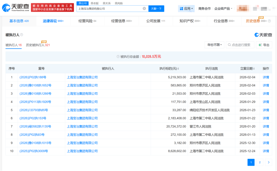 天眼查显示,上海宝冶集团有限公司法定代表人岳文彦,注册资本577784.9612万元。2026年以来,上海宝冶集团有限公司被8次列为被执行人;2025年以来该公司被16次列为被执行人,被执行总金额超1亿元。