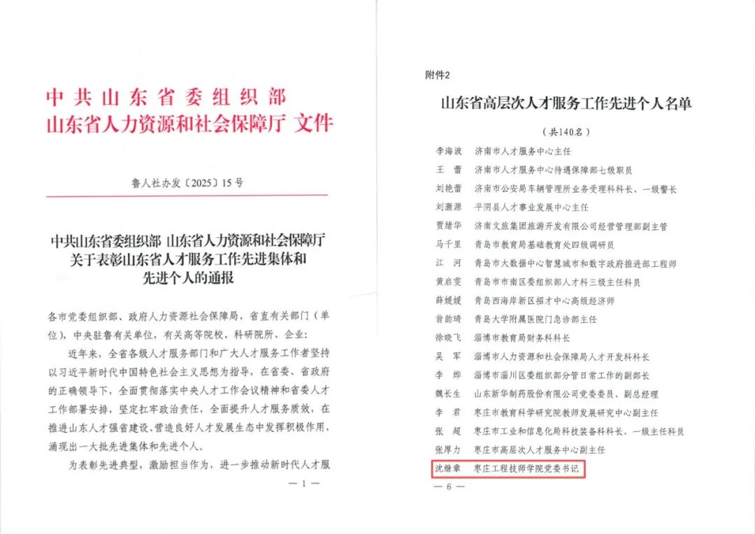 枣庄工程技师学院继连续四年获评“山东省技工教育先进集体”、成功入围“国家级高技能人才培训基地”建设项目之后,学院在人才服务领域再传捷报——近日,学院党委书记沈继章被山东省委组织部、省人社厅联合授予“山东省高层次人才服务工作先进个人”称号。这是学院整体人才工作持续提速、全面深化的生动体现。作为区域技能人才培养高地,学院始终坚守“为党育人、为国育才”初心,把技能人才培养作为发展的核心动力。如今,学院已构建起集“国家级基地、省级创新平台、市级技师工作站”于一体的人才培育矩阵,正以昂扬姿态,在“善城善匠 技美滕州”的品牌建设之路上阔步前行。