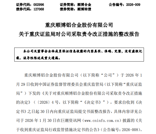 2月10日晚,顺博合金(002996)发布整改报告。此举关联的是,重庆证监局1月29日发布了关于对重庆顺博铝合金股份有限公司采取责令改正措施的决定。
