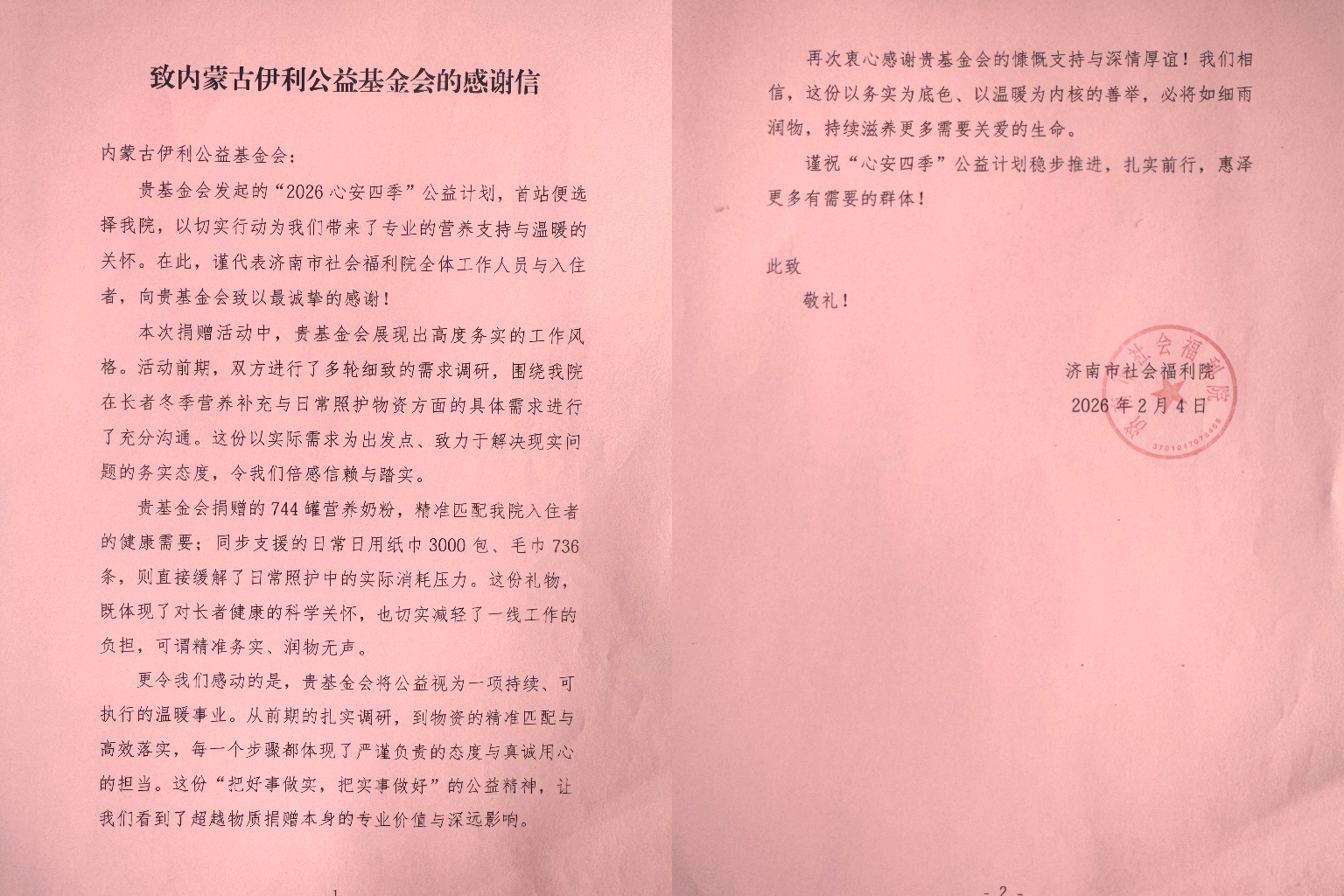 济南市社会福利院出具的感谢信,对基金会的精准务实态度表示高度认可,见证了一场以倾听为起点的温暖行动。