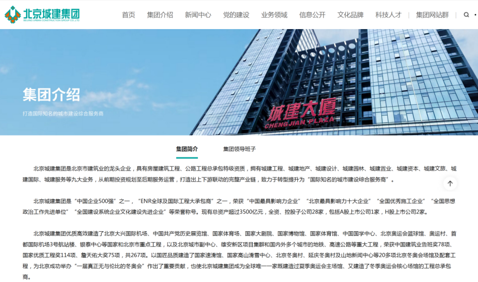 根据公司官网显示,该公司具有房屋建筑工程、公路工程总承包特级资质,拥有城建工程、城建地产、城建设计、城建园林、城建置业、城建资本、城建文旅、城建国际、城建服务等九个业务。企业总资产3650亿元,年营业收入1542亿元。