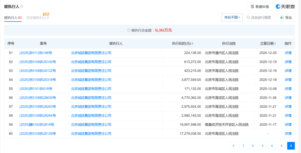 根据天眼查显示,北京城建集团有限责任公司成立于1993年,法定代表人为李伟东,注册资本为750,000万元。2025年以来,该公司已被60次列为被执行人,被执行总金额超1.6亿元。