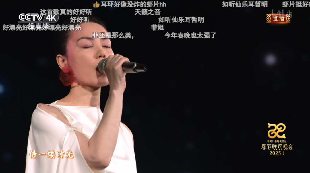 王菲深情演唱时,网友灵机一动突然来了句“耳环好像没炸的虾片。”