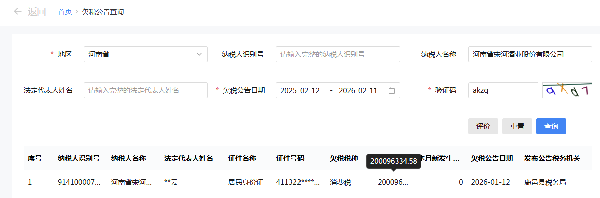 然而,摆在这位新任董事长面前的,是一份荆棘遍布的“家业”。早在半月之前的1月12日,国家税务总局鹿邑县税务局就已发布欠税公告,明确显示宋河酒业拖欠消费税高达200096334.58元,这笔巨额欠税成为压在企业身上的显性重担之一。