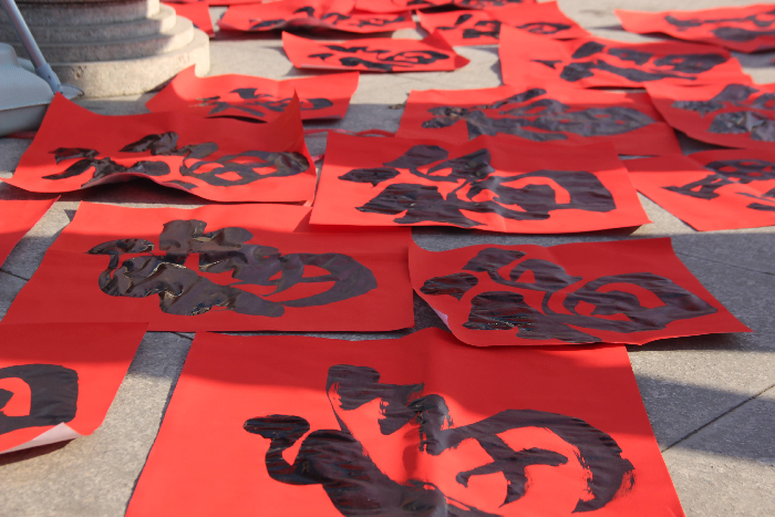 “写‘福’咯!”墨香送福区内,几张长桌整齐铺开,红纸铺展、笔墨备好,7名书法名家好手围在桌前,凝神静气、挥毫泼墨。铺纸的利落、蘸墨的醇厚、挥笔的洒脱,一系列动作行云流水、一气呵成,墨汁在红纸上晕染开来,一幅幅寓意吉祥的春联、一个个苍劲有力的“福”字跃然纸上,浓郁的墨香与喜庆的年味儿缠绕交织,暖意漫遍整个集市。