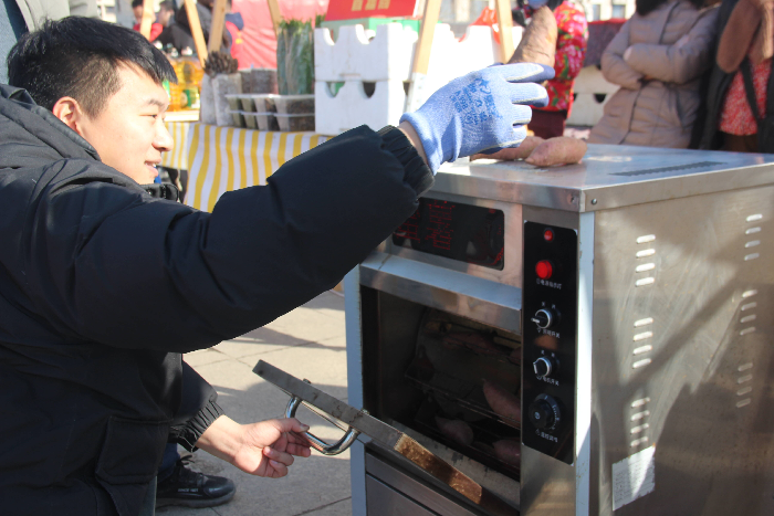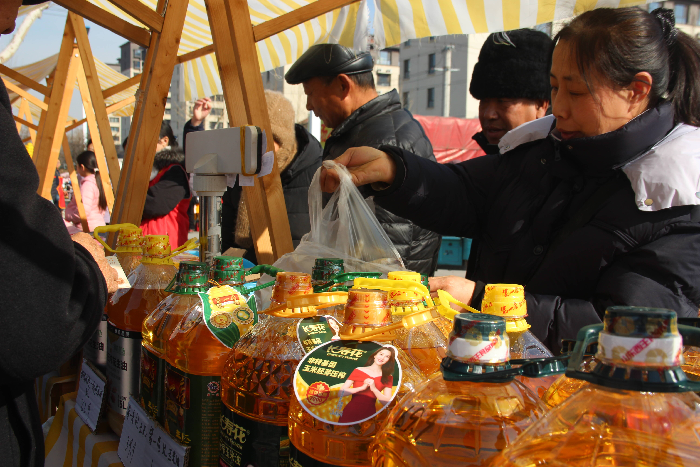 富鸣合作社的“无抗”鸡蛋个个圆润饱满、色泽鲜亮,整齐码放在礼盒中;明紫坊的紫麦面粉、紫麦面条,透着天然的深紫色光泽,淡淡的麦香沁人心脾;澳瑞农场的地瓜干软糯香甜、不粘不腻,粉皮粉条晶莹剔透;段桥丸子紧实弹牙、色香味美,泰昌大酒店的风干鸡色泽诱人,每一口都是原生态的醇厚滋味,都是百姓餐桌上不可或缺的“年味儿担当”。小耿村的草莓西红柿当属“年货爆品”,上百斤西红柿不到2小时便已售空,“这西红柿味儿正,有早年间的味道,又是红红火火的,最适合过年了”七十多岁的孙奶奶排着队购买草莓西红柿,对这份“年货”满是期待。