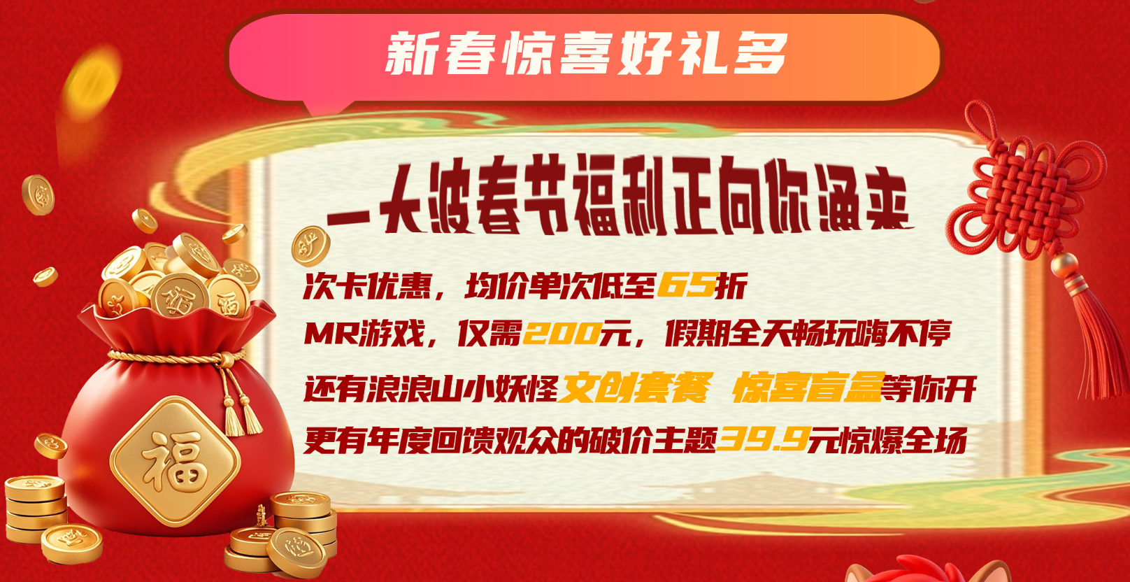 新春福利也同步加码,优惠力度直接拉满!次卡均价单次低至 65 折,MR 游戏春节期间200元畅玩;济南银座新辰店独家上线浪浪山小妖怪文创套餐盲盒,解锁新春小幸运;还有《山海经》主题年度回馈特价活动,超高性价比让玩家直呼过瘾。