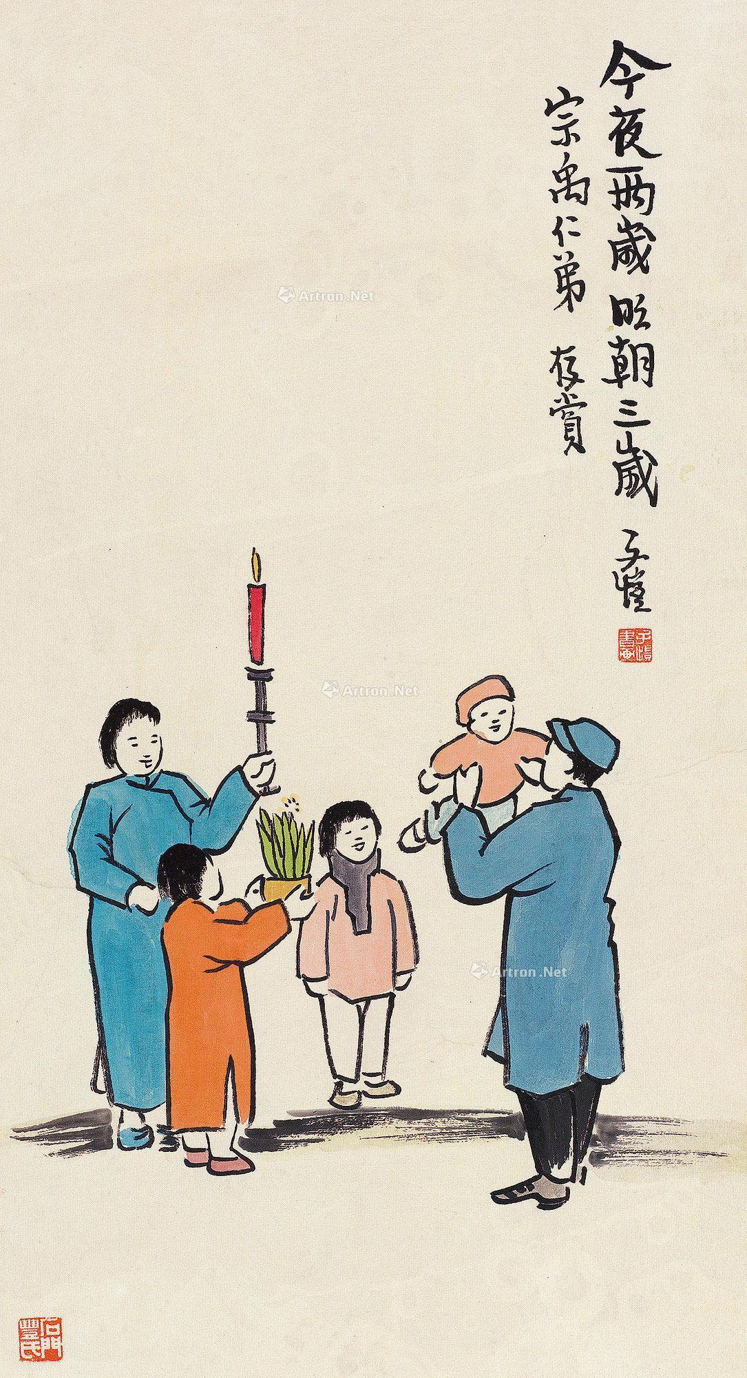 他的画里,年味是浸润在烟火气中的民俗仪式,藏着一代人的集体记忆,先生曾专门创作多幅画作,定格腊月送灶的民俗细节。《送灶》中,寻常农家的灶前暖意氤氲,灶台上整齐摆着一碗香甜的赤豆糯米饭和一盘糖饼,身着长衫的父亲神色恭敬,正躬身向灶君神像膜拜,两个孩童踮着脚尖紧随其后,眼神里满是好奇与虔诚,悄悄打量着灶前的一切。另一幅《灶君上天》与之呼应,画面右侧摆着红绿纸糊的灶轿,轿身点缀着冬青柏子与纸金元宝,轿旁孩童手里攥着细小的香火,仿佛在目送灶君启程,藏着“粘住灶君嘴,不让说坏话”的小心思。先生用细腻的笔触,将每一幅画的民俗细节具象化,没有华丽的辞藻,却通过一碗糯米饭、一顶纸灶轿、一串小动作,把旧时光里的年俗烟火,刻画得淋漓尽致。就像他在《送灶》画作题字那般,“二十三这一天,家家烧赤豆糯米饭”,这份烟火气,正是年味的底色,是家人团圆的温暖,是岁月安然的慰藉。