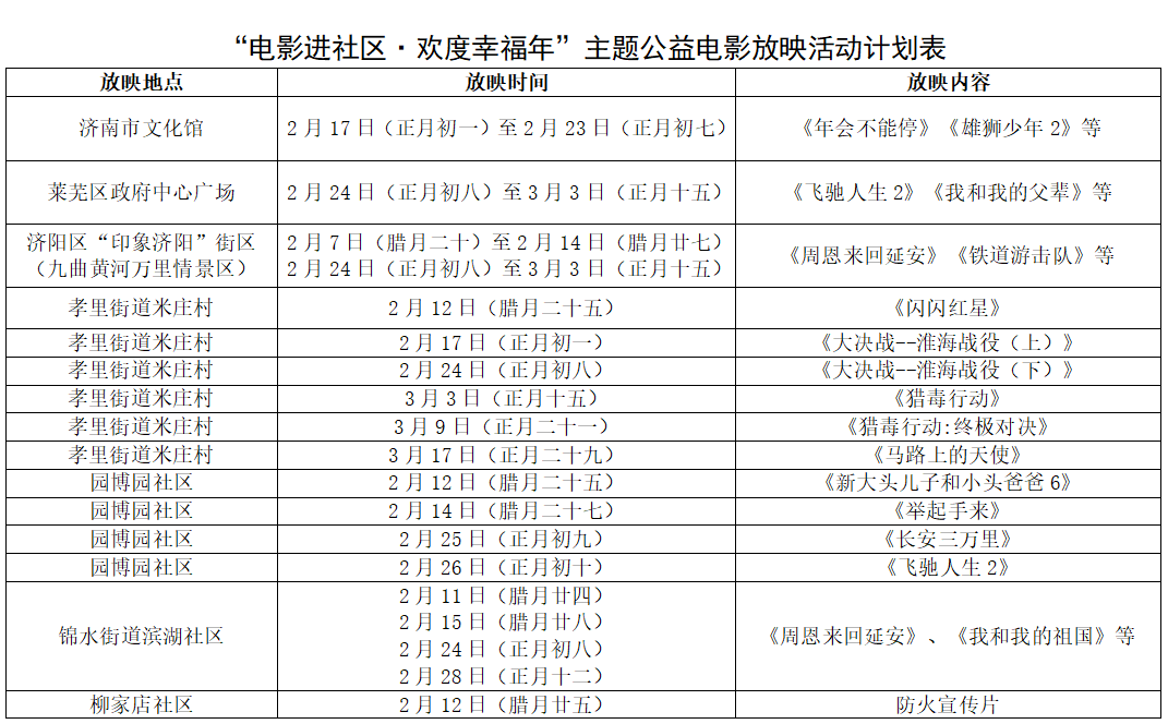 为丰富市民春节期间精神文化生活,营造欢乐祥和、温馨团圆的节日氛围,进一步提升群众文化获得感与幸福感,济南市正式启动 “电影进社区·欢度幸福年” 主题公益电影放映活动。