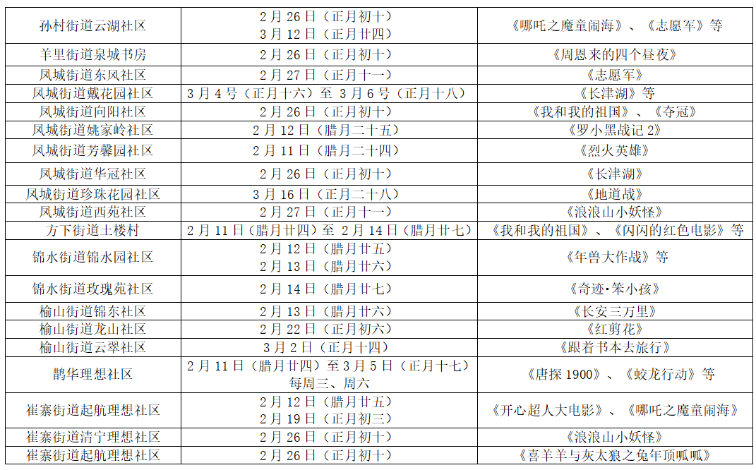 2月17日(正月初一)至2月23日(正月初七)将在济南市文化馆放映《年会不能停》《雄狮少年2》,2月24日(正月初八)至3月3日(正月十五)将在莱芜区政府中心广场放映《飞驰人生2》《我和我的父辈》等影片。节日期间,济阳区组织开展电影进景区活动,将在九曲黄河万里情景区放映《周恩来回延安》《铁道游击队》等影片。长清、莱芜、平阴等区县将在社区试点放映厅放映《长安三万里》、《举起手来》等经典影片。