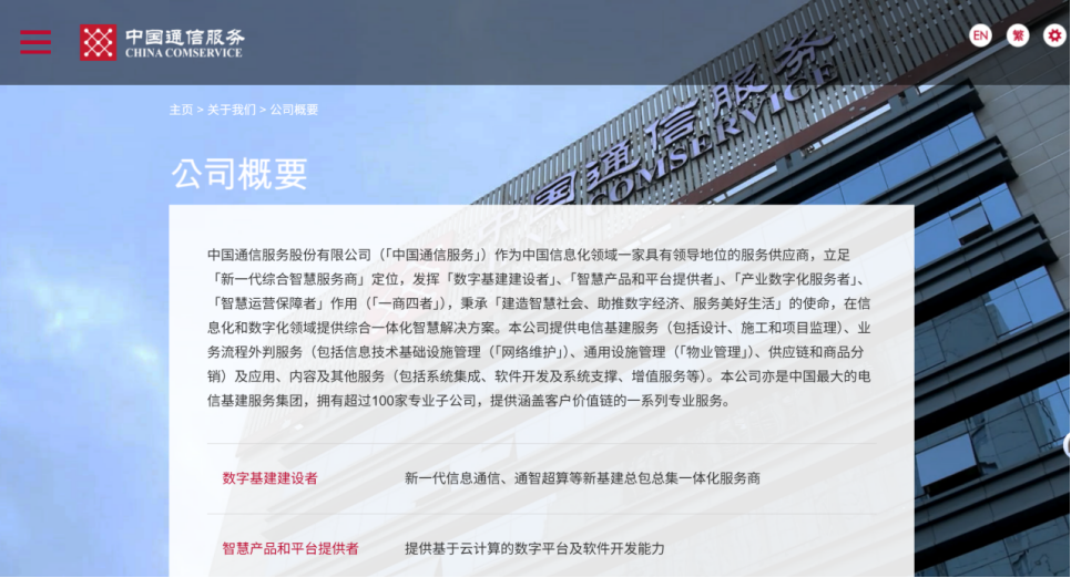 中国通信服务股份有限公司(以下简称“中国通信服务”)官网显示,中国通信服务提供电信基建服务、业务流程外判服务及应用、内容及其他服务等。中国通信服务发行的H股于2006年12月8日在香港联合交易所有限公司主板成功挂牌上市。