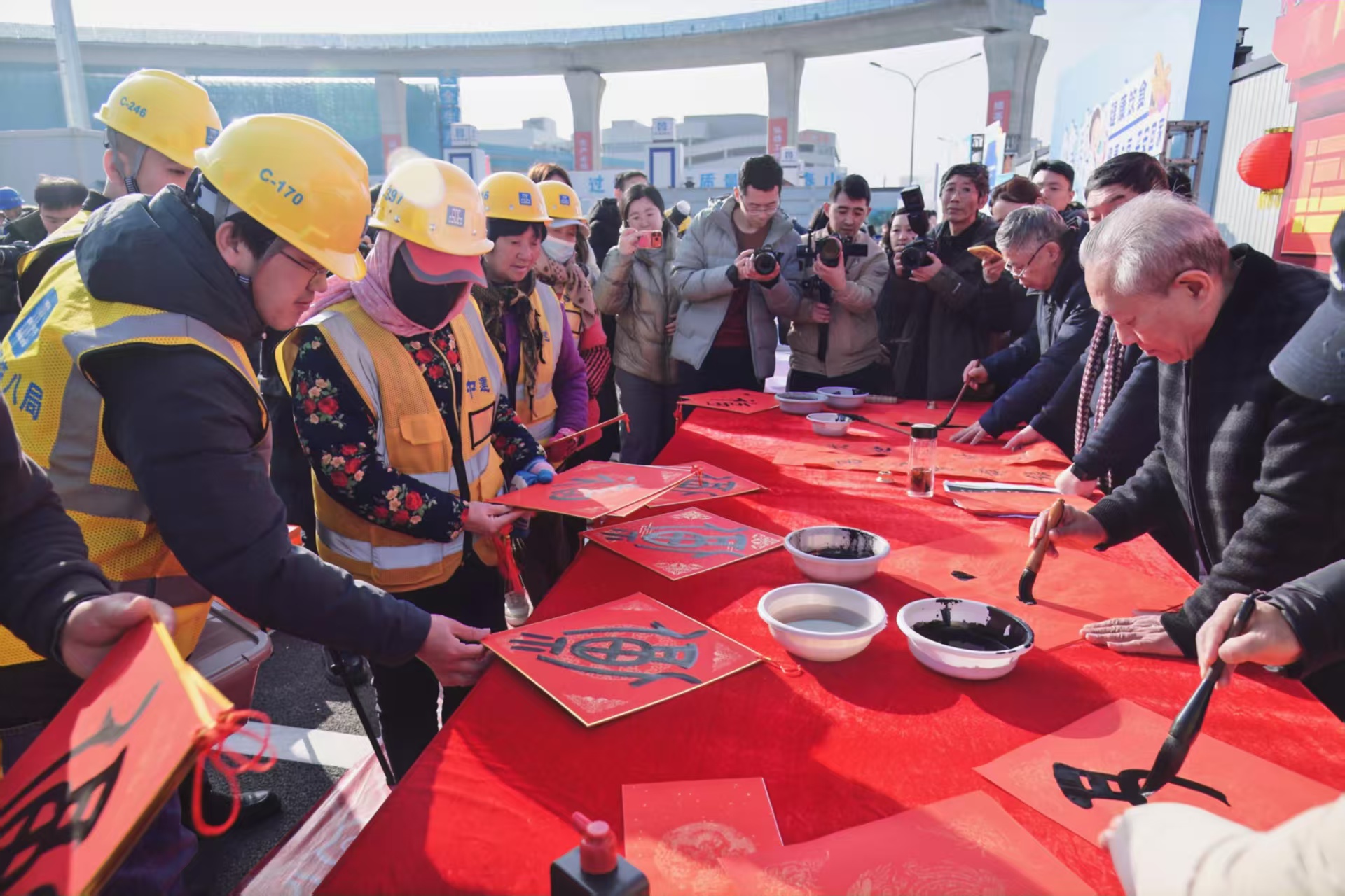 金马送福来,春风暖人心。2月12日一大早,中建八局凤凰黄河大桥南延工程智慧管控中心院内灯笼高挂、彩旗飘扬,大红福字儿包裹着浓浓的年味儿。广场上关爱服务展区吸引了来自各行各业的农民工朋友,有人在询问农民工就业服务政策,有人在关注交通返乡的宣传,有人在进行健康查体,有人在围观书法家写春联……一张张笑脸洋溢着幸福和甜蜜。